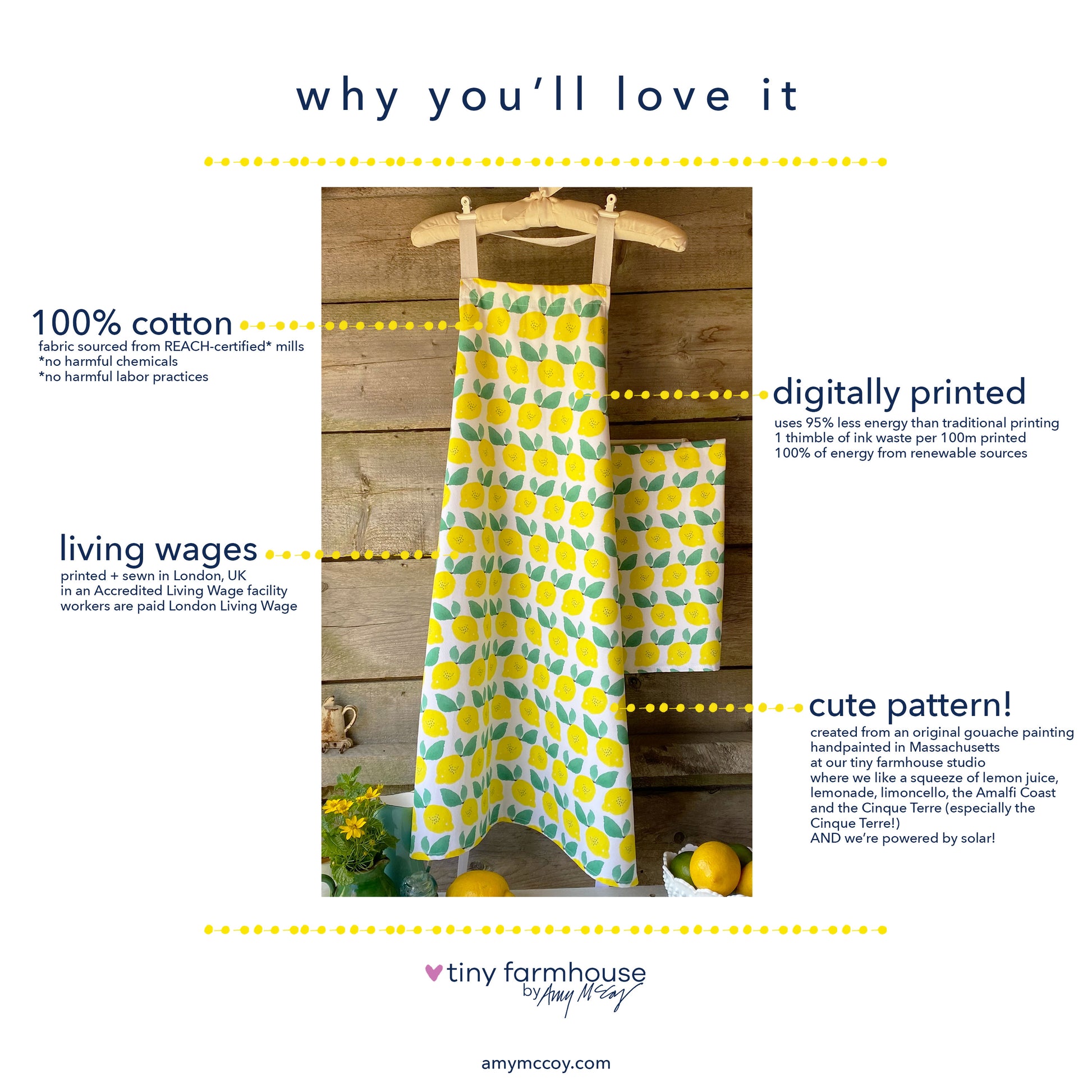 Channel a little slice of the Amalfi Coast and the Cinque Terre. A cheerful lemon pattern apron for happy times in the kitchen or at the grill. Even more cheery when paired with the lemon rows tea towel and the lemon rows journal.